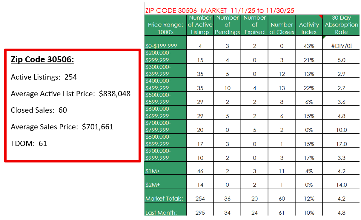 👉 What this means: ZIP Code 30506 encompasses a broad range of homes, from modest single-family and neighborhood homes closer to Gainesville to premium Lake Lanier properties with docks and lake views — so median values can differ widely depending on which segment you focus on.