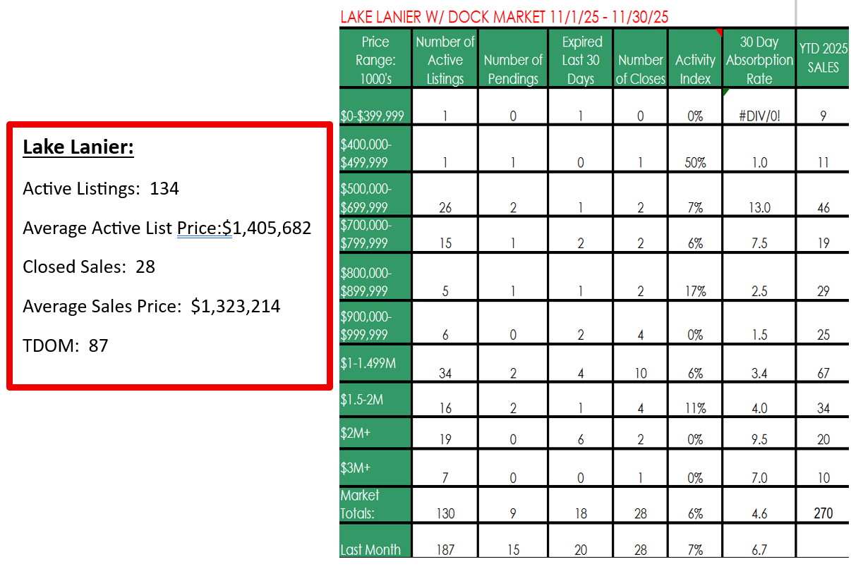 The Lake Lanier area Inventory is rising: The number of active lakefront listings — including private docks and marina-style community slips — is up ~49 % year-over-year, giving buyers more options than the past few years.