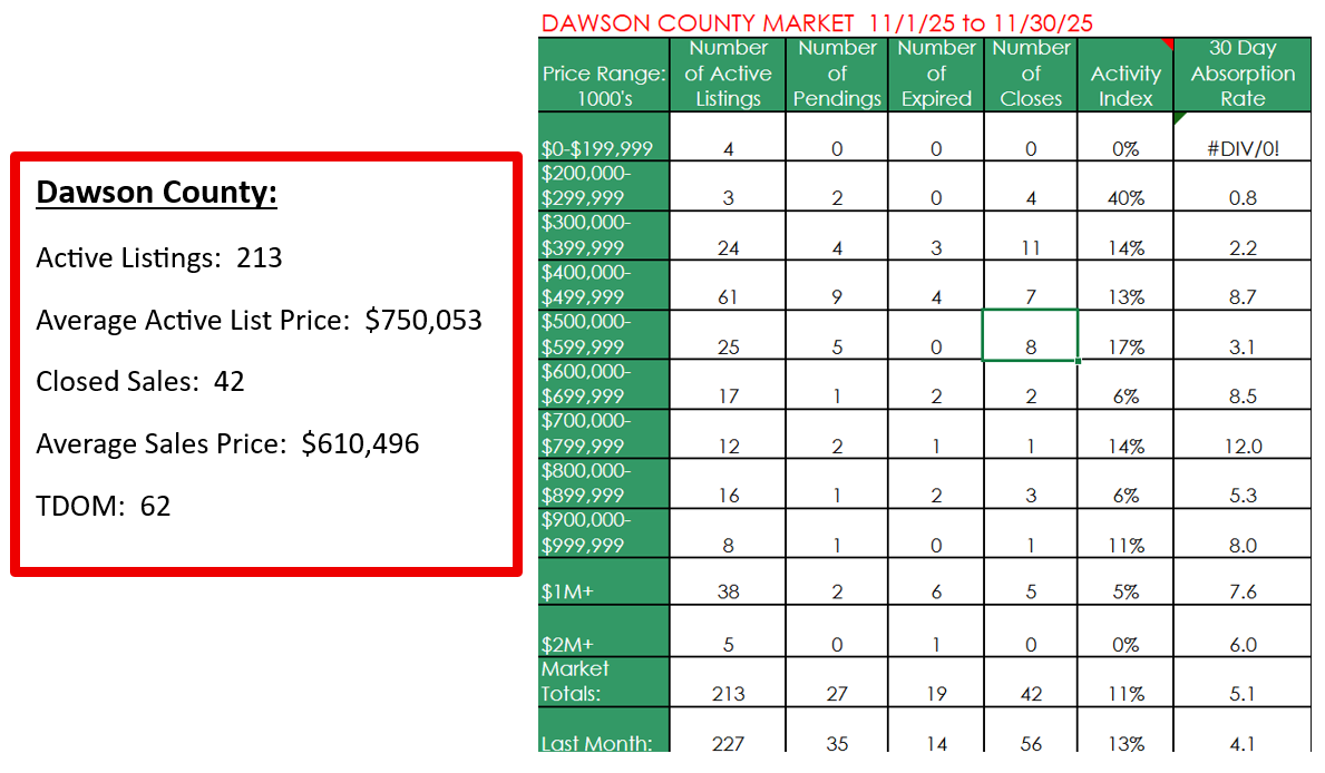 If you’re thinking about selling your home in North Metro Atlanta, particularly around Forsyth County, Cumming, and UP400, understanding the local market trends is essential. From average sales prices to number of homes sold and days on market, these key metrics help you make smarter, more informed decisions. Our December 2025 Look Back Market Report highlights the most important data for Forsyth, Lake, Dawson, Lumpkin counties, and even Zip Code 30506, giving you a clear picture of what’s happening in the local real estate market right now. Whether you’re planning to sell soon or just want to stay informed, this report provides all the insights you need to navigate the North Metro Atlanta housing market with confidence.