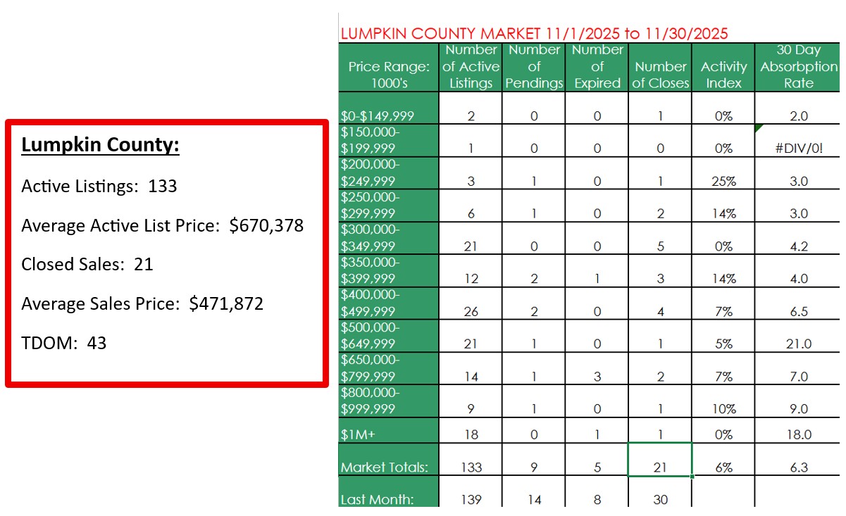 In Lumpkin County, sales are down compared to last year: recent market reports show about 34–45 homes sold monthly, roughly 20–23% fewer sales year-over-year — demonstrating some seasonal slowdown and cooler buyer demand.