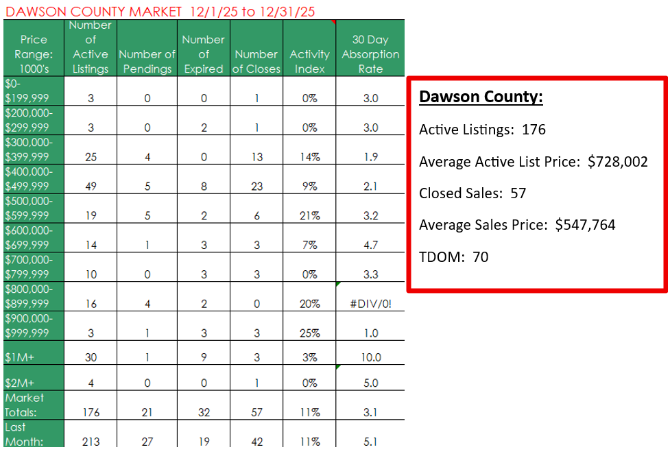 Dawson County — Year-End 2025 Market Trends: Home Prices - Median home sale price: ~$539,450 in December 2025, up about year-over-year.Number of homes sold: Dawson County had significantly more closings year-over-year by late 2025.