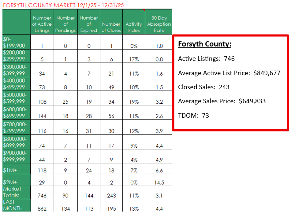 If you’re thinking about selling your home in North Metro Atlanta, particularly around Forsyth County, Cumming, and UP400, understanding the local market trends is essential. From average sales prices to number of homes sold and days on market, these key metrics help you make smarter, more informed decisions. Our January 2026 Lookback Market Report highlights the most important data for Forsyth, Lake, Dawson, Lumpkin counties, and even Zip Code 30506, giving you a clear picture of what’s happening in the local real estate market right now. Whether you’re planning to sell soon or just want to stay informed, this report provides all the insights you need to navigate the North Metro Atlanta housing market with confidence.