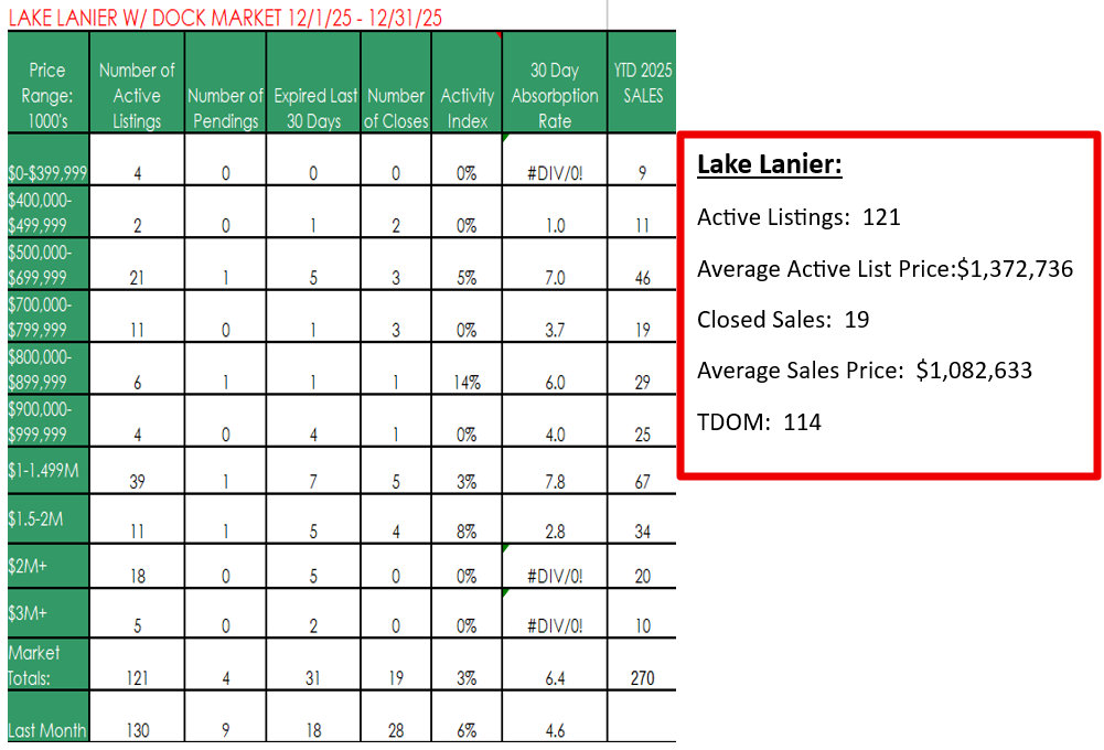 The Lake Lanier area Inventory is rising: Overall Market Trends - Inventory rising — buyers now have more choices than in recent years, with a nearly 49% jump in active listings for lake homes with docks or slips versus 2024. Sales activity rebounding: Around 315 homes with private docks or community slips sold in 2024 (a ~36% annual increase) — and trends continued strong into 2025. Luxury segment growing: A significant share of lakefront sales are now luxury homes (many over $1M) — partly because waterfront with dock access is rare and high-demand. Why this matters: Limited private dock permits from the U.S. Army Corps of Engineers keeps deep-water private access scarce, so buyers value properties with existing docks or deeded slips. Private dock permits are rare and regulated; ensure any permitted dock transfers properly at closing and meets Corps of Engineers requirements. Deep-water access and high-use coves significantly enhance value vs shallow docks or distant water. Deeded boat slips (especially covered slips) also add resale value and lifestyle convenience.